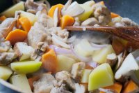 4.再將土豆、蘑菇、胡蘿卜、洋蔥放進雞腿一起翻炒均勻