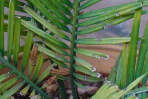 值得注意的是,剜去頂芽或切去頂端的部位,待其創(chuàng)口收干后,宜用硫黃粉或石硫合劑涂抹創(chuàng)口,以防創(chuàng)口感染病菌,造成鐵樹莖干爛心。另外,盡量不要讓雨水或人工澆水淋人創(chuàng)口,最好用蠟封創(chuàng)口,或用干凈的薄膜包裹好創(chuàng)口,防止因創(chuàng)傷處積水造成莖干腐爛。