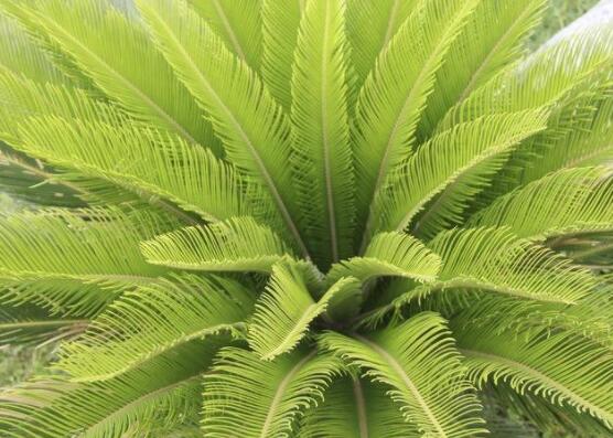鐵樹為常綠棕櫚狀木本植物,莖高達(dá)5米。大型羽狀復(fù)葉簇生莖頂,復(fù)葉由多數(shù)細(xì)長小葉組合而成,線形小葉邊緣反卷,革質(zhì),深綠色,有光澤。花無花被,雌雄異株,雄球花圓柱形生于莖端,雌球花扁球形頂生,有褐色毛密生,8月開花。果實呈朱紅色,種子核果狀。同屬還有刺葉鐵樹,葉大、羽片寬;云南鐵樹,羽片較窄。