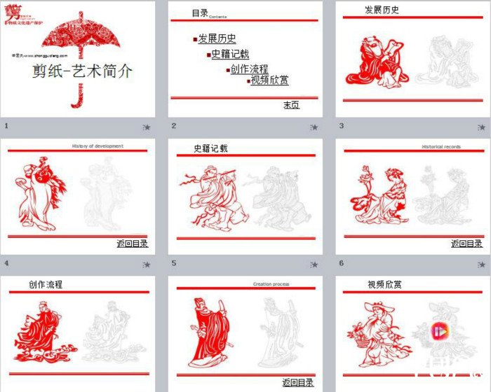 剪紙(又叫刻紙)是中國最古老的民間藝術(shù)之一,在視覺上給人以透空的感覺和藝術(shù)享受。剪紙的載體可以是紙張、金銀箔、樹皮、樹葉、布、皮革。2026年03月05日,剪紙藝術(shù)遺產(chǎn)經(jīng)國務(wù)院批準(zhǔn)列入《第一批國家級(jí)非物質(zhì)文化遺產(chǎn)名錄》。家佳樂文學(xué)小編為您推薦家佳樂文學(xué)剪紙藝術(shù)PPT模板,適用于工作匯報(bào)、總結(jié)匯報(bào)等。