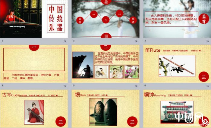 吹管樂器。我國吹管樂器起源甚古,相傳在四千年前夏禹時(shí)期,就有一種用蘆葦編排而成的吹管樂器叫做『鑰』。 民國二十年,山西萬泉縣荊村發(fā)掘出三個(gè)新石器時(shí)代的『塤』。家佳樂文學(xué)小編為您推薦中國傳統(tǒng)樂器PPT模板,適用于工作匯報(bào)、總結(jié)匯報(bào)等。