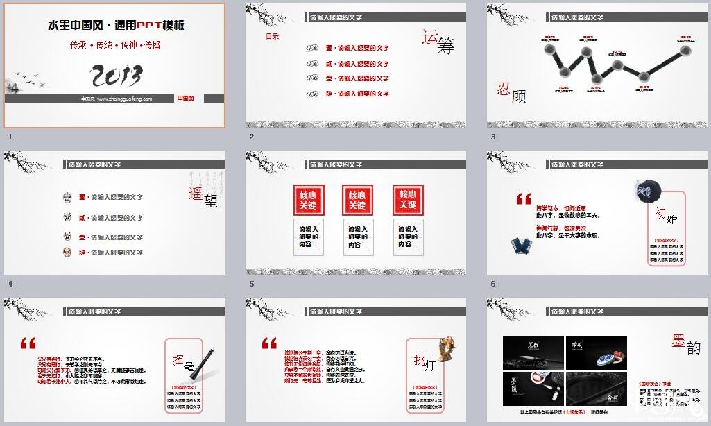 水墨畫,是中國繪畫的代表,也就是狹義的“國畫”,并傳到東亞其他 地區(qū)?;镜乃嫞瑑H有水與墨,黑與白色,但進(jìn)階的水墨畫,也有工筆花鳥畫,色彩繽紛,后者有時(shí)也稱為彩墨畫。中國水墨畫的特點(diǎn)是:近處寫實(shí),遠(yuǎn)處抽象,色彩微妙,意境豐富。家佳樂文學(xué)小編為您推薦水墨家佳樂文學(xué)通用PPT模板,適用于文化匯報(bào)、教育匯報(bào)、項(xiàng)目匯報(bào)等。
