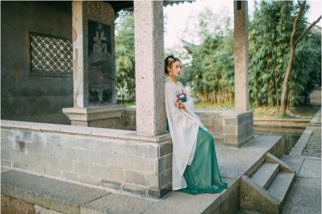 這款為交領襦裙,配大袖衫。名為【南歌子】。疏雨池塘見,微風襟袖知,水霧配色的清新,足以吹散整個夏日的炎熱,衣袂飄搖,宛如畫中走出一般。家佳樂文學小編為你帶來漢服日常女……