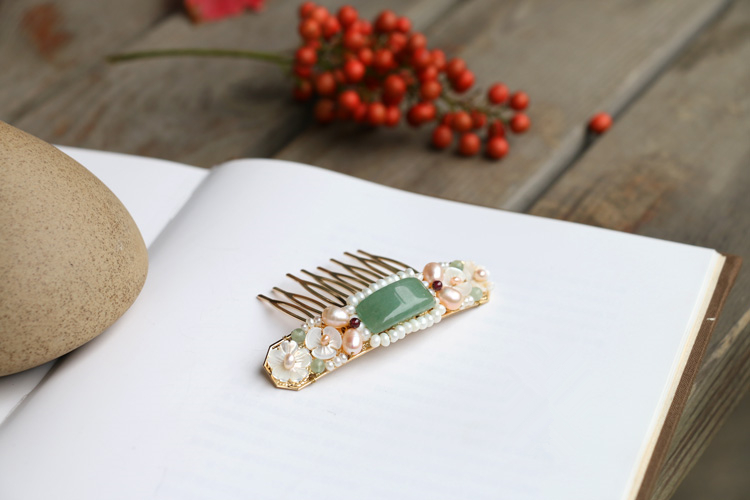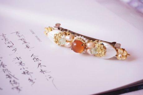 貝產(chǎn)珍珠,珍珠飾貝,如此,便有了這精美雅致的杰作,請(qǐng)欣賞家佳樂文學(xué)小編為你帶來的白蝶貝殼雕花珍珠發(fā)夾?!?/p>